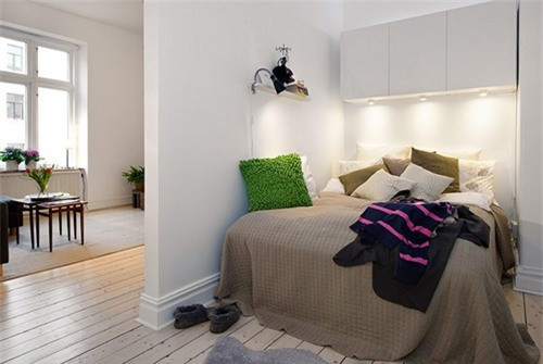 Do căn phòng chỉ vừa đủ để chiếc giường nên các chi tiết trang trí cũng được tối giản đến mức tối đa. Vấn đề lưu trữ được giải quyết bằng 3 chiếc tủ nhỏ thiết kế trên đầu giường.