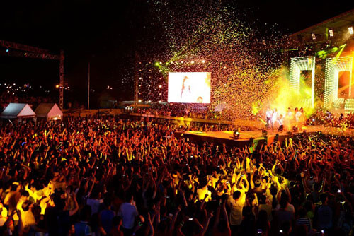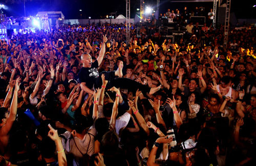 Sân khấu và khán giả cuồng nhiệt lắc theo điệu nhạc điện tử.