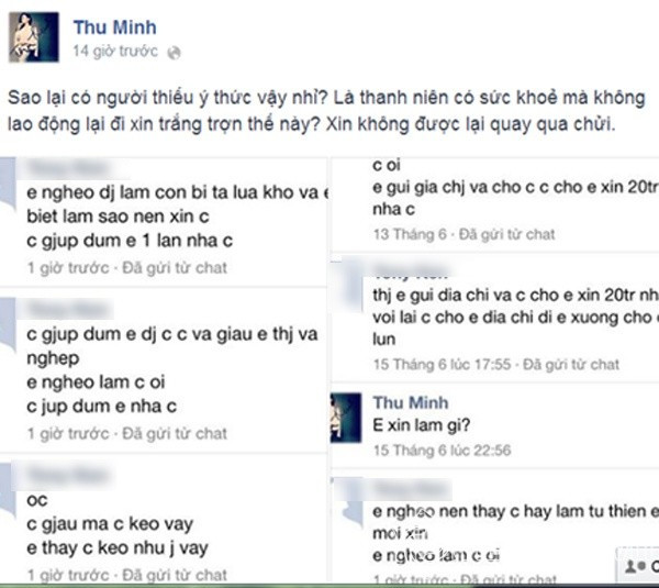 Trong đoạn tin nhắn, người này kể khổ và nhận thấy Thu Minh thường làm từ thiện nên ngỏ ý muốn xin cô số tiền 20 triệu. Người này thậm chí muốn xin địa chỉ của nữ ca sĩ để có thể đến tận nơi nhận tiền. Sau khi không đạt được mục đích, người này thay đổi thái độ và gọi Thu Minh là keo kiệt. Trên trang cá nhân, nữ ca sĩ bức xúc viết: “Sao lại có người thiếu ý thức vậy nhỉ? Là thanh niên có sức khỏe mà không lao động lại đi xin trắng trợn thế này? Xin không được lại quay qua chửi”.