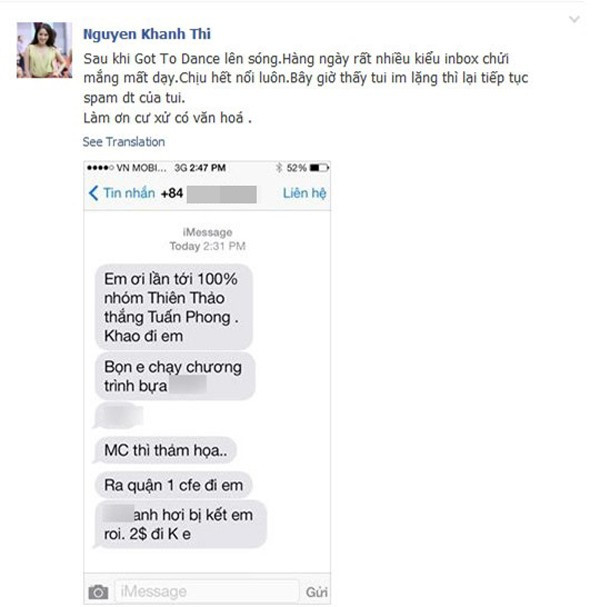 Trường hợp của nữ kiện tướng dancesports Khánh Thi dường như nghiêm trọng hơn. Tháng 10 năm ngoái, chương trình do Khánh Thi làm MC Vũ điệu đam mê - Got To Dance phát sóng, cô nhận được nhiều những tin nhắn chửi tục tĩu từ inbox trang cá nhân cho đến điện thoại của một số máy lạ.