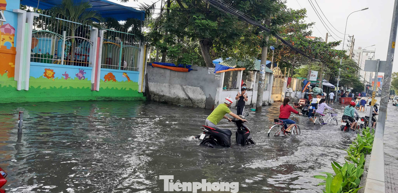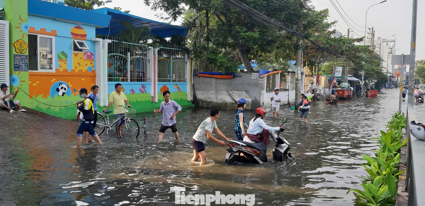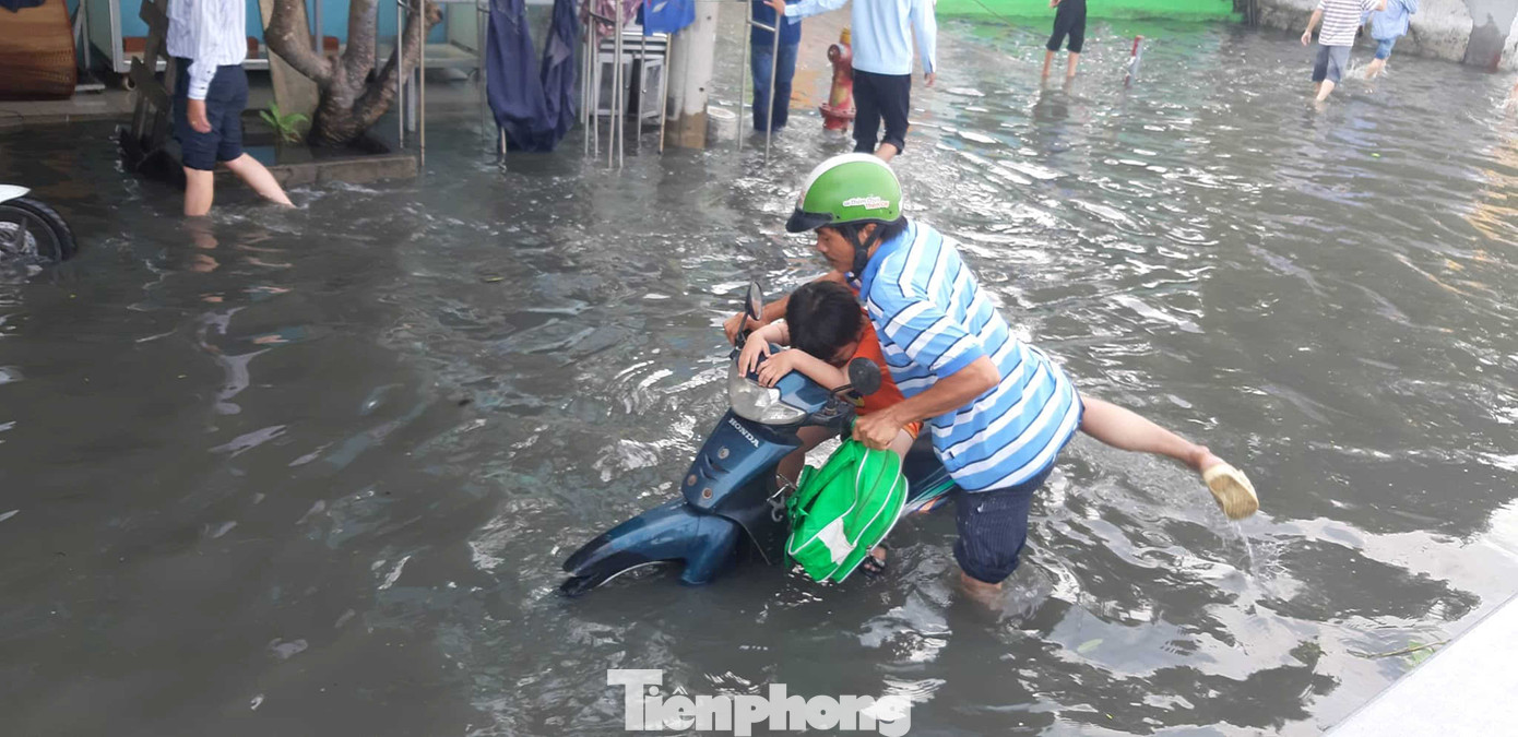 Đến sáng 30/9, nhiều tuyến đường trên địa bàn quận 8, TPHCM vẫn ngập chìm trong nước khiến giao thông gặp nhiều khó khăn, học sinh phải lội nước đến trường.