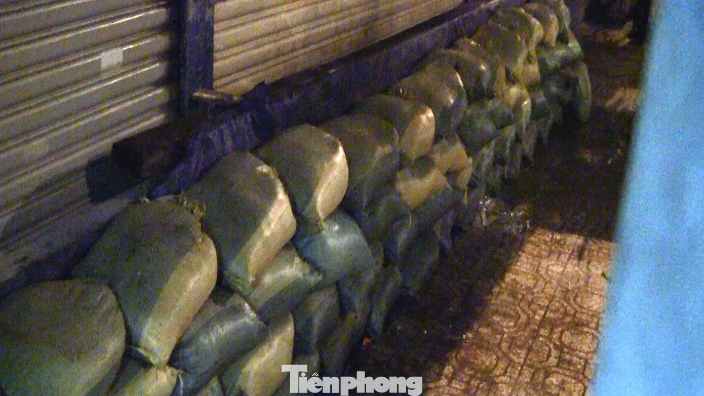Nhiều hộ dân phải dùng bao cát, tấm bạt, ván... dể chắn trước nhà ngăn nước tràn vào trong.