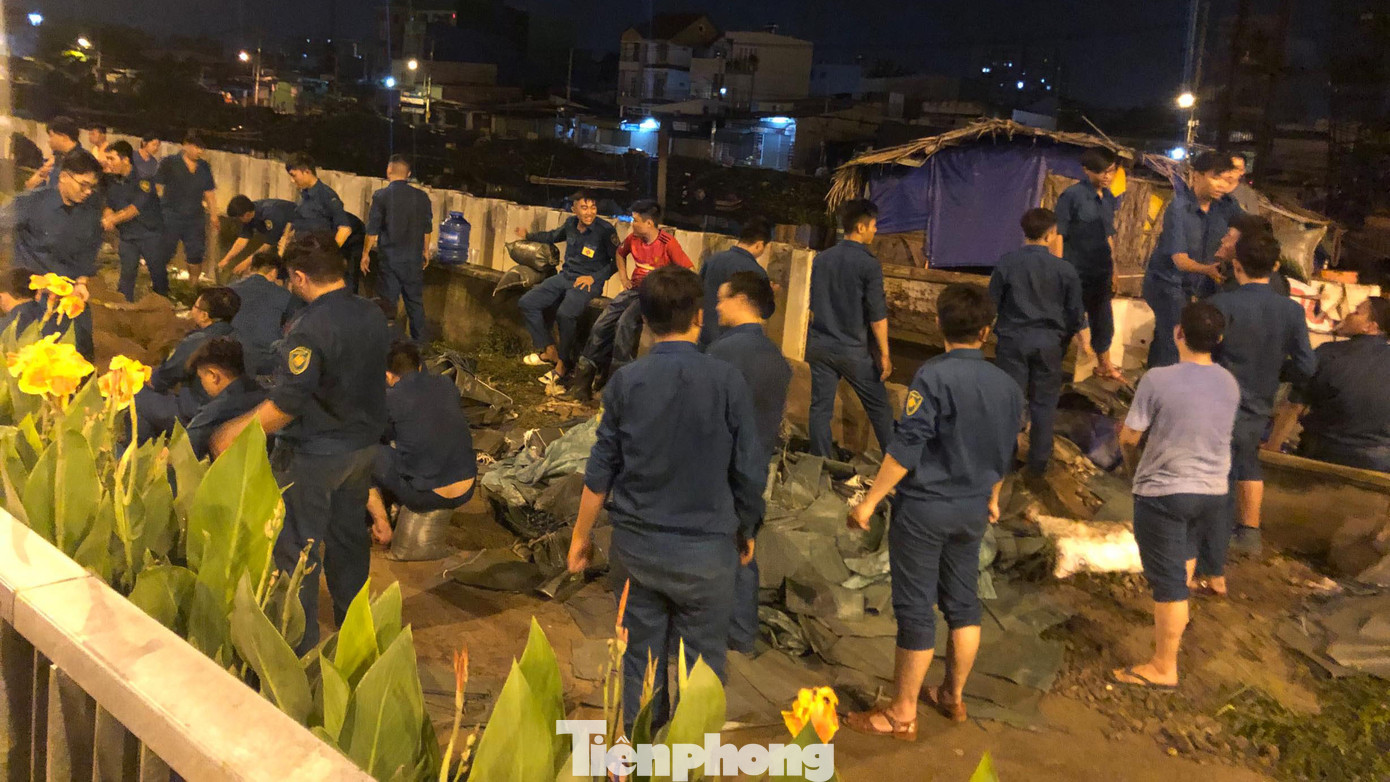 Ngay trong đêm, chính quyền địa phương đã huy động hàng trăm người thuộc lực lượng dân quân tự vệ, dân phòng, công an… vận chuyển gần 10.000 bao cát để chặn bờ, khắc phục sự cố phần bờ kè hơn 30m bị vỡ.