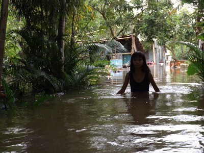 Gia đình bà Nguyễn Thị Thái cũng trong hoàn cảnh tương tự, khi gần 1 ha vườn cây ăn trái, cùng ao nuôi cá bị ngập sâu trong nước.