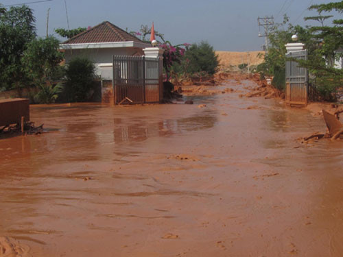 Tại hiện trường, nhiều vật dụng của công ty như gỗ, sắt cũng bị cuốn ra đường. Bùn đỏ tràn ngập quanh khu vực, dài gần 3 km. Một lượng bùn lớn trôi ra biển khiến nước đỏ ngầu.