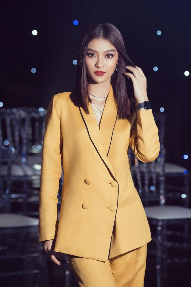 Á hậu Kiều Loan diện vest vàng kín đáo và cá tính.