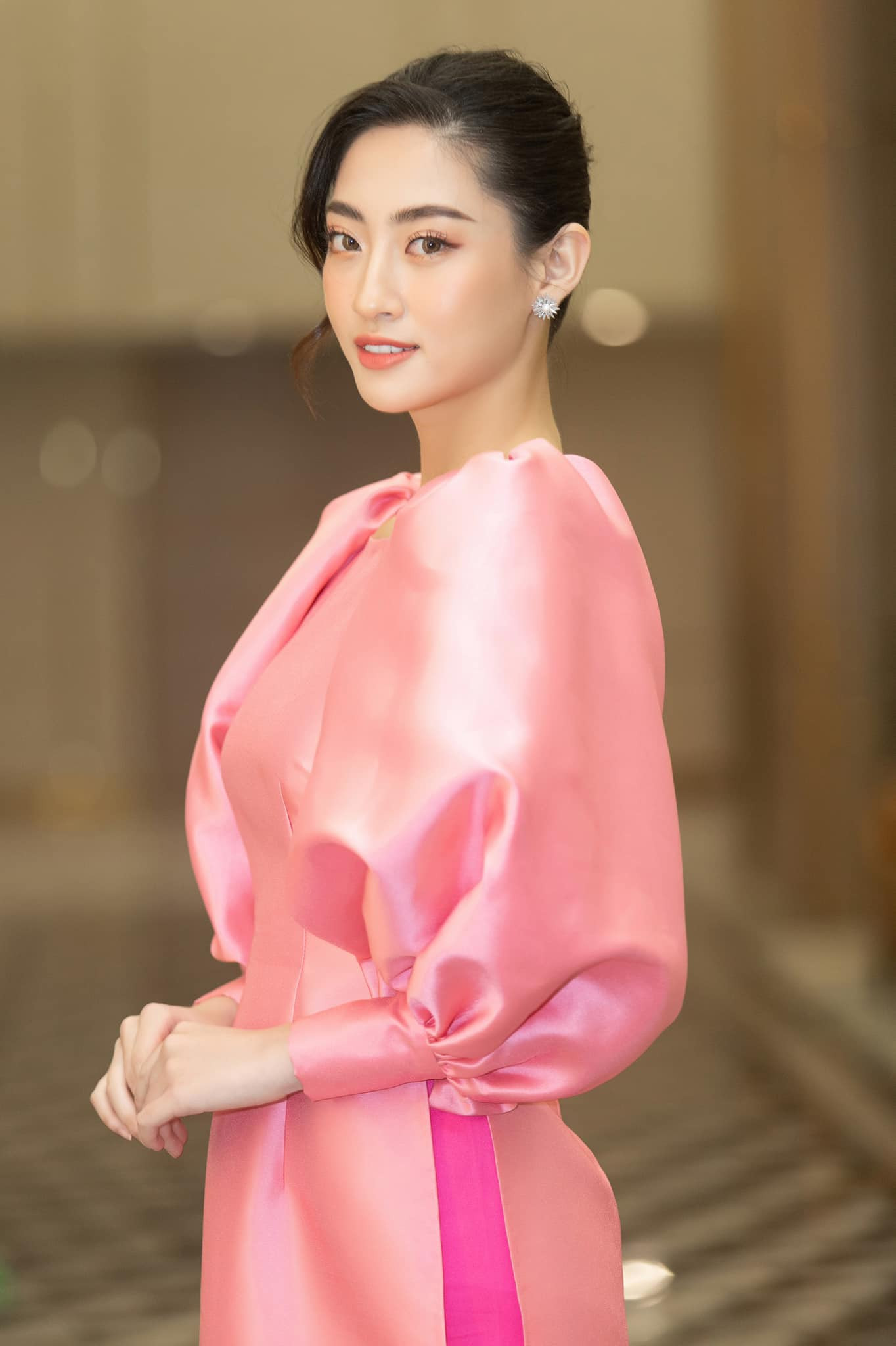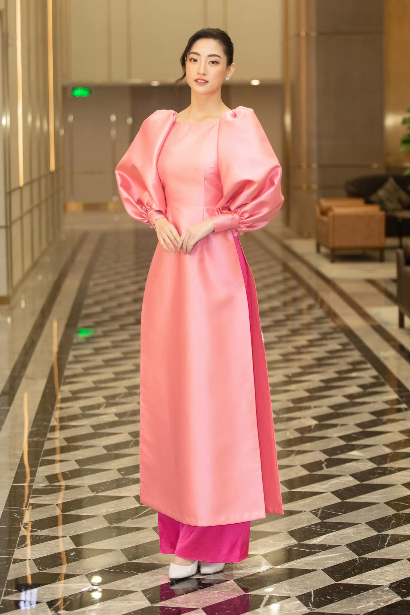 Miss World Vietnam 2019 diện áo dài màu hồng có kiểu dáng tay phồng lạ mắt.