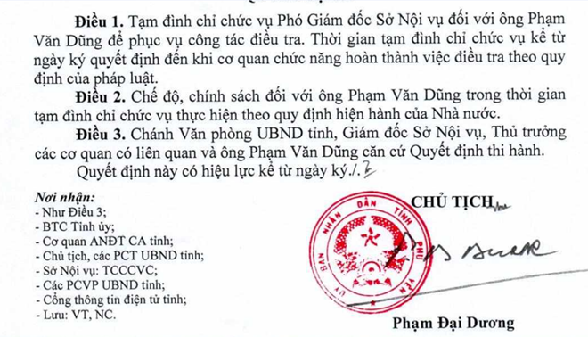 Chủ tịch UBND tỉnh Phú Yên quyết định tạm đình chỉ chức vụ Phó Giám đốc Sở Nội vụ đối với ông Phạm Văn Dũng sau khi cán bộ này bị khởi tố.