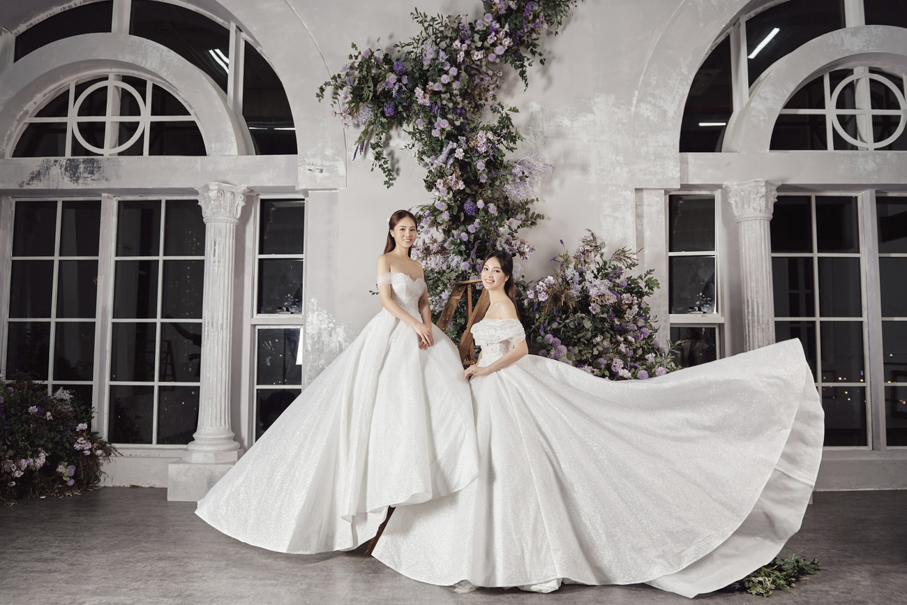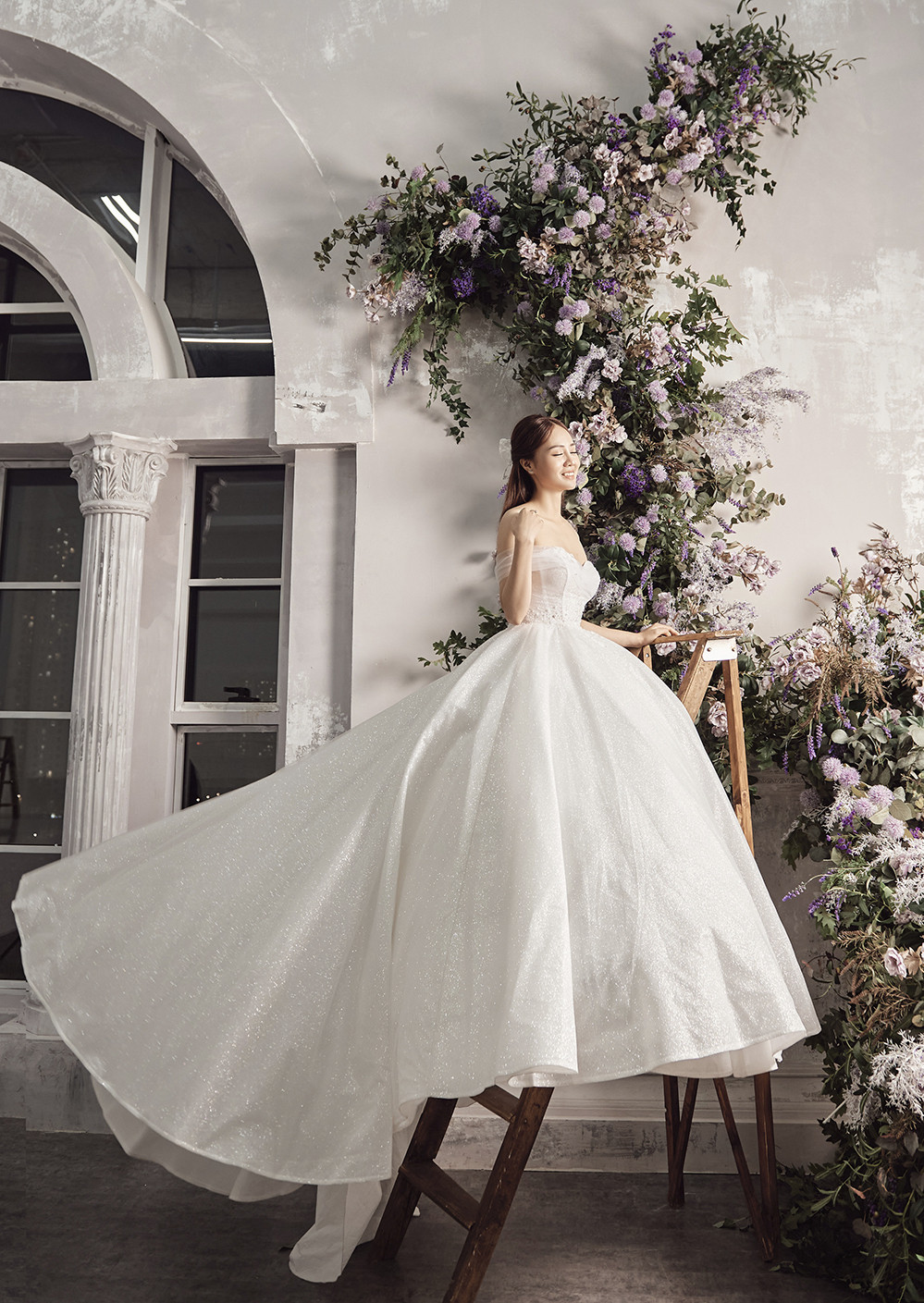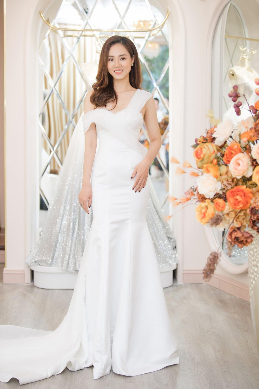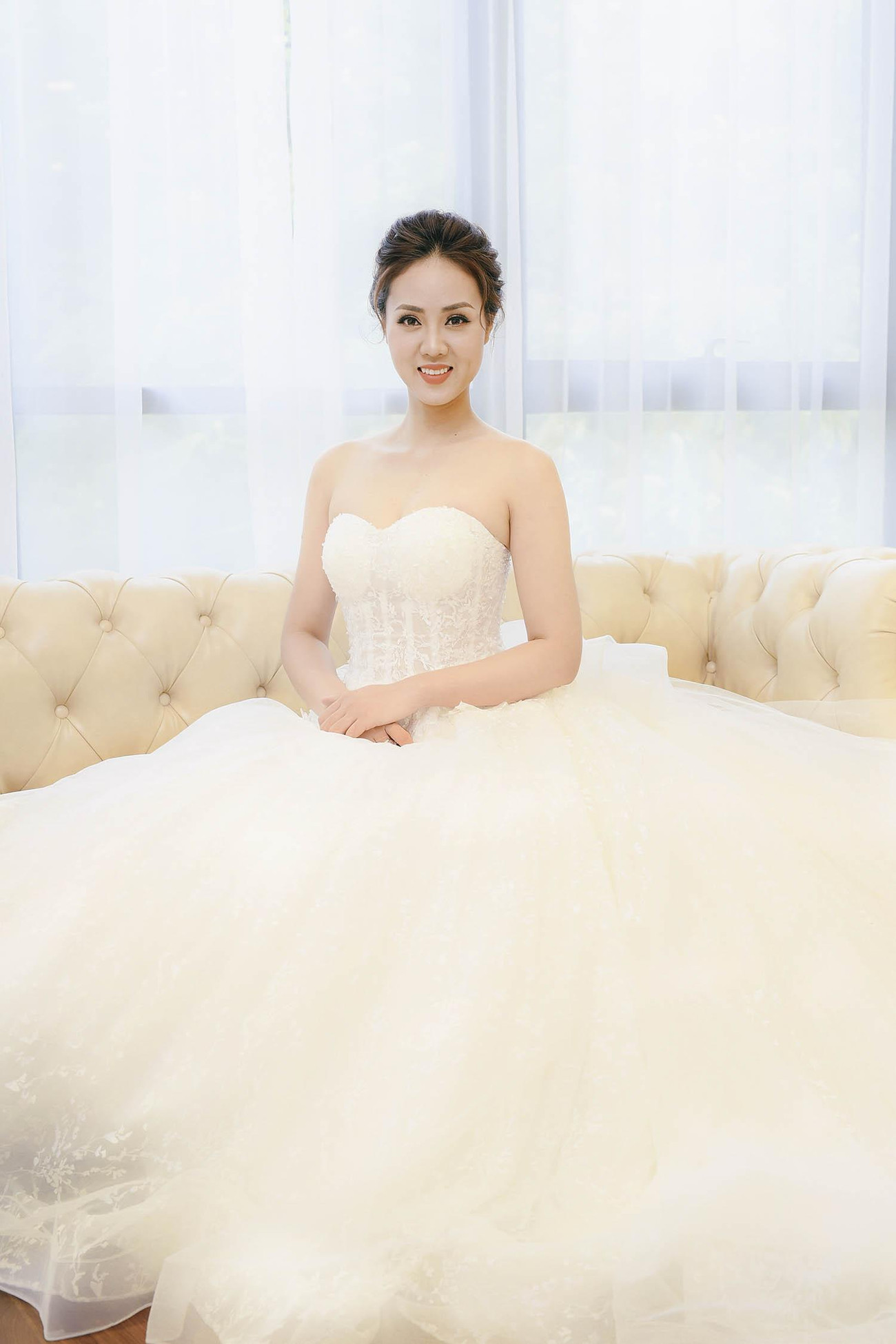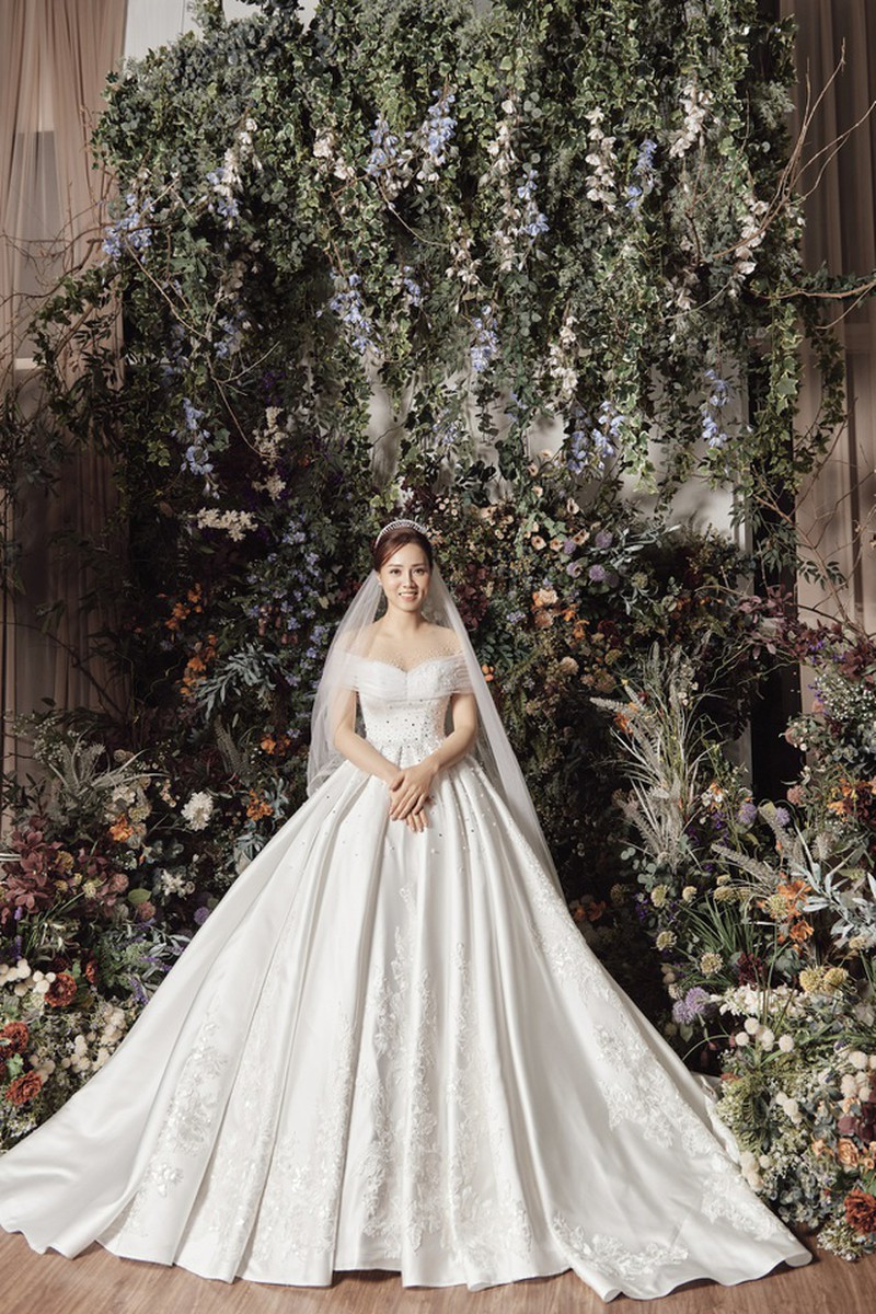 Với nhan sắc dịu dàng, trong trẻo, bạn gái của Công Lý dễ dàng chinh phục các loại váy cưới trễ vai khoe vòng một gợi cảm.
