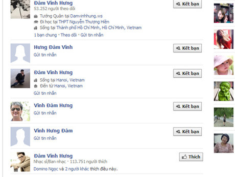 Chỉ cần một vài động tác tìm kiếm trên Facebook, ta cũng có thể dễ dàng tìm thấy hàng chục tài khoản có tên nam ca sĩ Đàm Vĩnh Hưng, Hồ Ngọc Hà... không thể phân biệt đâu là giả, đâu là thật.