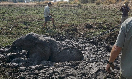 Sau khi phát hiện voi nhỏ bị mắc kẹt dưới hố bùn, một nhóm thợ săn trâu rừng quyết định giải cứu con vật bằng cách buộc chân nó vào dây thừng và kéo ra khỏi hố, Caters News hôm qua đưa tin.