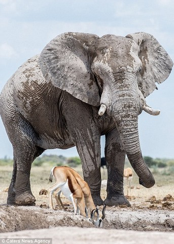 Chú voi khổng lồ rõ ràng không thích phải xếp hàng đến lượt uống nước và tắm bùn ở một công viên tại Botswana. Thay vì chờ đợi, loài thú lớn nhất trên cạn đã dùng sức mạnh của mình và chiếm đoạt nguồn nước quý giá từ linh dương châu Phi bé nhỏ.