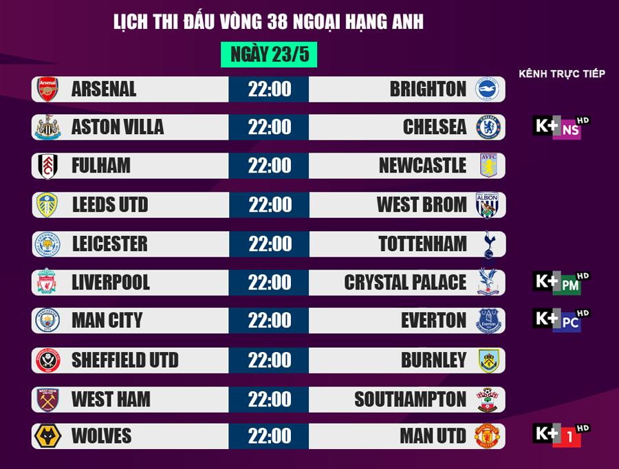 Ngoài 3 trận đấu trên, vòng hạ màn Ngoại hạng Anh đêm nay còn nhiều cặp đấu đáng chú ý khác. Trên sân nhà, Man City sẽ tiếp đón Everton. Sau trận đấu này, thầy trò Pep Guardiola sẽ chính thức nâng cao chiếc cúp vô địch Ngoại hạng Anh mùa giải 2020-21. Trong khi đó, MU sẽ làm khách trên sân của Wolves ở vòng đấu cuối cùng.
