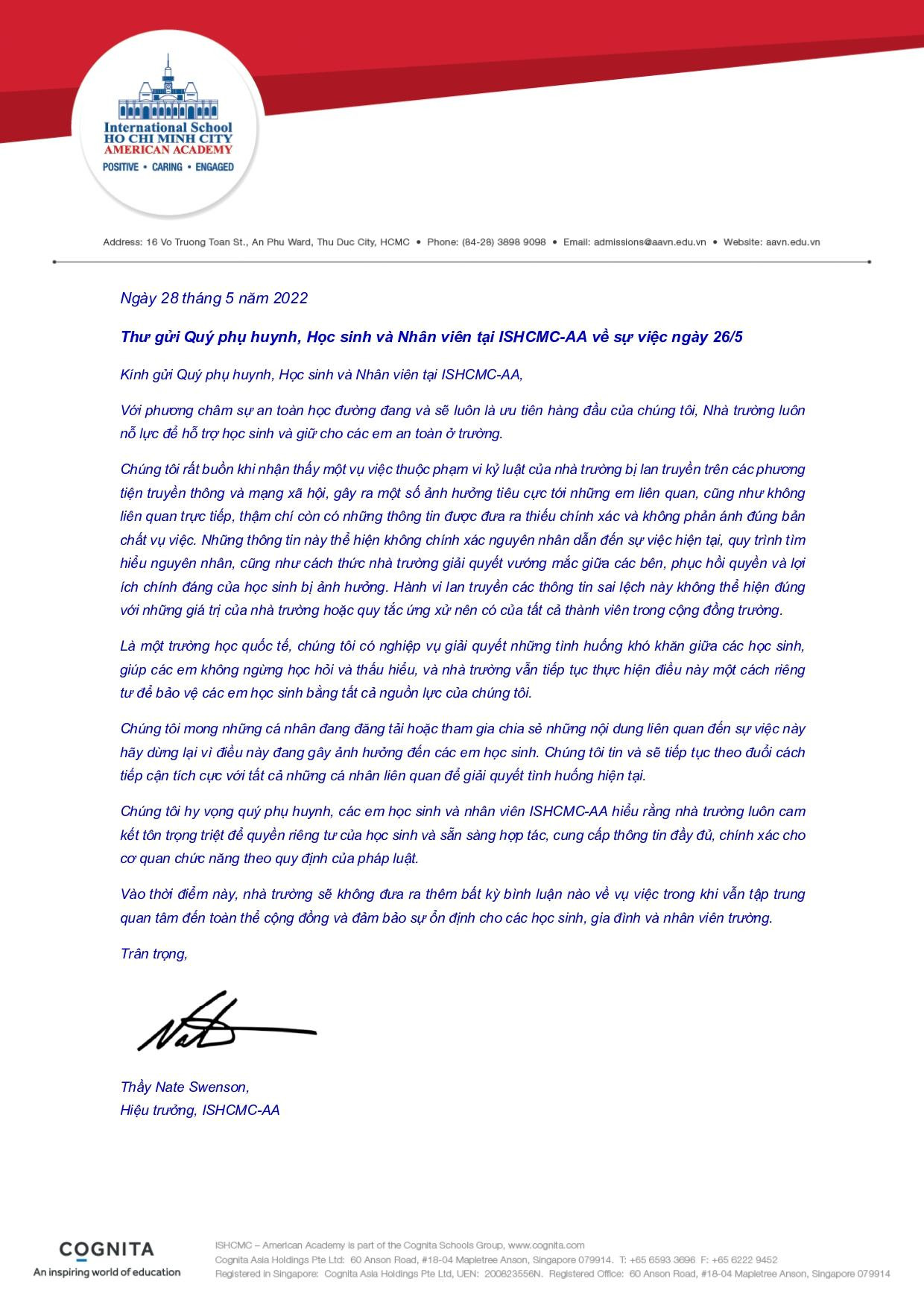 Được biết, phía Trường quốc tế American Academy (ISHCMC-AA) cũng đã có báo cáo gửi Phòng GD&ĐT TP Thủ Đức, Sở GD&ĐT TP.HCM. Ông Nguyễn Thái Vĩnh Nguyên, Trưởng phòng GD&ĐT TP Thủ Đức cho biết, phòng đã nhận được báo cáo của trường. "Quan điểm của Phòng GD&ĐT TP Thủ Đức cũng thống nhất như với Sở GD&ĐT TP.HCM, yêu cầu nhà trường xử lý vụ việc, không để kéo dài. Gây dư luận không tốt, ảnh hưởng đến quá trình học tập, rèn luyện của học sinh" - ông Nguyên thông tin.