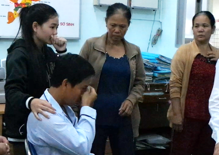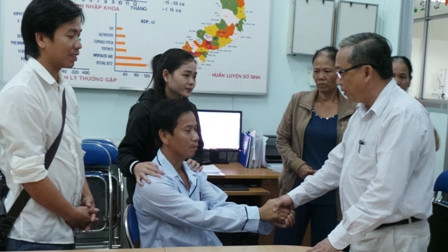 Để hạn chế nguy cơ nhiễm khuẩn cho khoa Hồi sức, TS.BS Nguyễn Thanh Hùng, Giám đốc Bệnh viện Nhi Đồng 1 đã đặc cách cho bé Quốc Huy ra phòng họp gặp mặt cha. Cậu bé được nhân viên y tế trao tận tay cho gia đình. Đặt đôi nạng gỗ xuống đất, anh Nam dang đôi tay run run bế đứa con thơ vào lòng. Nhìn cậu con trai nhỏ bé, kháu khỉnh nhưng chân phải đã bị đoạn đến khớp gối, người cha mếu máo, hai hàng nước mắt lăn dài trên gò má cháy nắng. Anh nghẹn ngào không nói nên lời.