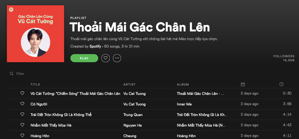Vũ Cát Tường tiết lộ những bài nhạc mình yêu thích giúp người hâm mộ phần nào khám phá ra các ca khúc đang "trói tim" nữ ca sĩ cũng như tìm hiểu thêm về bạn nhạc tạo ra nhiều cảm hứng cho Vũ Cát Tường. (Ảnh: NVCC) Trong playlist đa phần là những ca khúc có giai điệu nhẹ nhàng nhưng không kém phần bùng nổ, tràn đầy năng lượng vui tươi, có thể kể đến như: Mong Cho Anh (Mỹ Tâm), Em Mới Là Người Yêu Anh (MIN), Lần Cuối (Ngọt Band), Cảm Ơn Và Xin Lỗi (Chillies) hay Trái Đất Tròn Không Gì Là Không Thể (Trung Quân),...