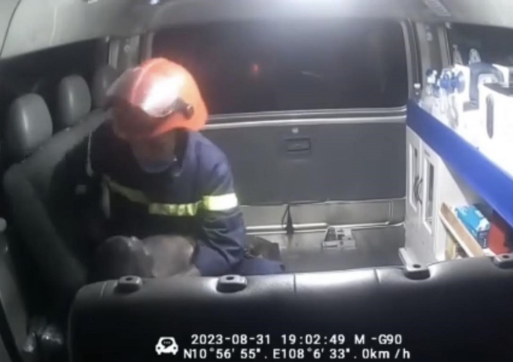 Hình ảnh chiến sĩ cảnh sát PCCC nỗ lực sơ cứu cháu bé 3 tuổi, trên đường đến bệnh viện. (Ảnh: Cắt từ camera xe cứu thương)