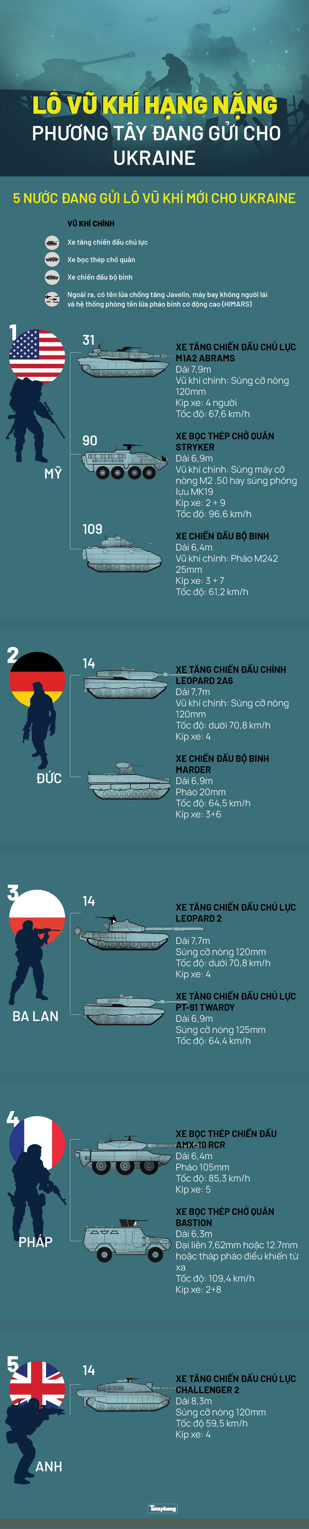 TPO - Mỹ quyết định gửi 31 xe tăng tối tân M1 Abrams do nước này sản xuất cho Ukraine. Chính phủ Đức thông báo nước này cấp phép để hãng sản xuất chuyển xe tăng Leopard 1 cho Ukraine sau khi chấp thuận viện trợ Leopard 2. Ba Lan tuyên bố sẽ cung cấp cho nước láng giềng 14 chiếc Leopard 2...