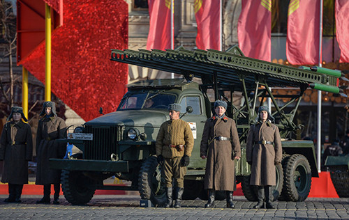 Những người tham gia cuộc diễu binh kỷ niệm cuộc duyệt binh huyền thoại 7 tháng 11 năm 1941 trên Quảng trường Đỏ ở Moskva, bên dàn hỏa tiễn BM-13 thời Thế chiến II.