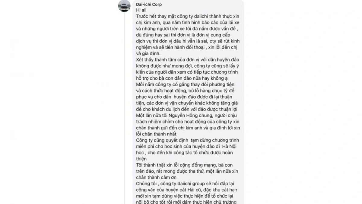 Tuy nhiên, lời xin lỗi chưa kịp xoa dịu dư luận thì đơn vị này lại thông báo tạm dừng chương trình hỗ trợ vé xe miễn phí cho học sinh huyện đảo Cát Hải đi học tại Hà Nội - một chương trình thiện nguyện mà Daiichi từng thực hiện trong nhiều năm qua. Theo đó, việc tạm dừng này nhằm “sắp xếp lại một cách chu đáo hơn”.