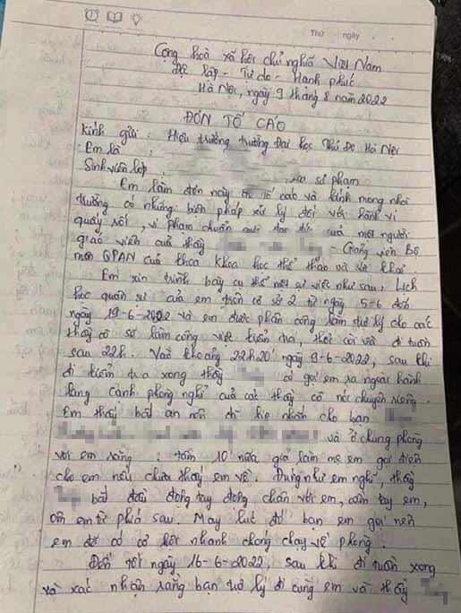 "Em thấy phẫn nộ và suy nghĩ rất nhiều mới dám nói ra sự việc. Mong nhà trường có biện pháp xử lý nghiêm khắc về hành vi vi phạm đạo đức của thầy T., bởi hành động của thầy là vi phạm pháp luật", nữ sinh chia sẻ trong đơn tố cáo.