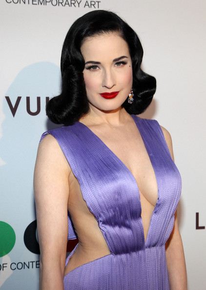 Mới đây, Dita Von Teese đã xuất hiện trong bữa tiệc của Loius Vuitton trong bộ váy thướt tha, gợi cảm màu tím