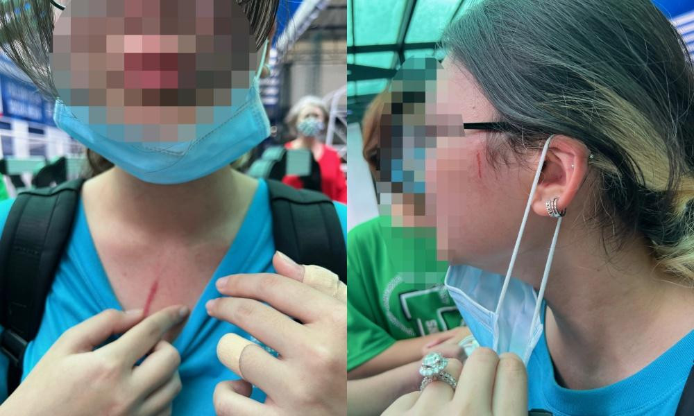 | Con chị T.H.T. cùng một số bạn học có nhiều vết xước ở ngực, mặt, tay, chân sau khi bị nữ sinh cùng trường đánh. Ảnh: FBNV |