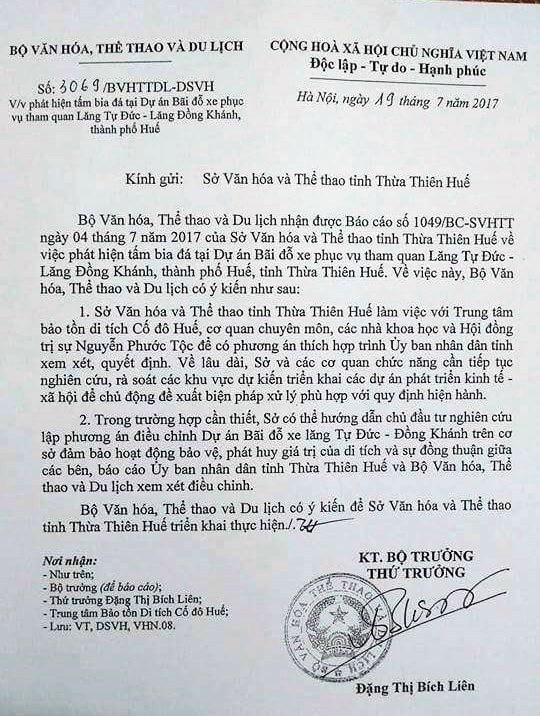 Trước đó, vào ngày 19/7, Thứ trưởng Bộ VH-TT&DL Đặng Thị Bích Liên có Công văn 3069/BVHTTDL-DSVH với nội dung liên quan đến việc phát hiện tấm bia đá tại Dự án bãi đỗ xe phục vụ tham quan lăng Tự Đức - Đồng Khánh (phường Thủy Xuân, Huế).