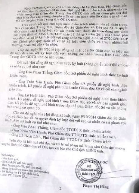 Căn cứ nội dung làm việc của Hội đồng kỷ luật, Giám đốc Sở GD-ĐT Thanh Hóa đã ban hành quyết định kỷ luật ở mức độ khiển trách đối với các ông: Đào Phan Thắng, Giám đốc Trung tâm; Trần Văn Hạnh, Lê Hoài Liên, Phó Giám đốc Trung tâm.