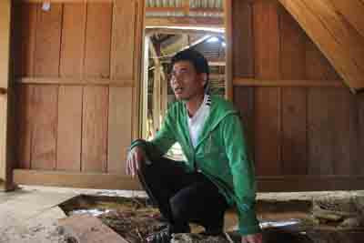 Ba ngôi nhà bị cuốn trôi cùng nhiều tài sản của người dân thôn Pà oi (xã La Êê sau sự cố. Trong ảnh ông A Lăng Dhep – mếu máo khi mọi tài sản của gia đình bị cuốn trôi sau sự cố thủy điện