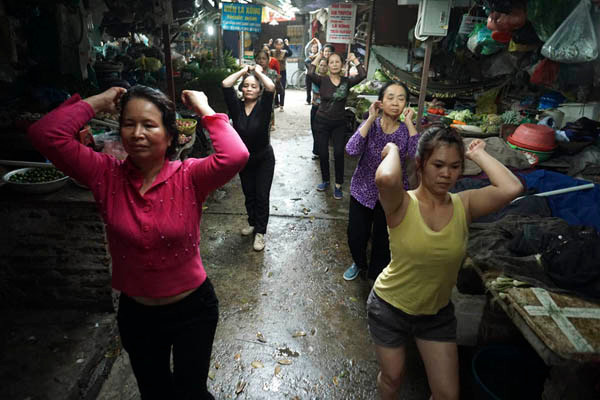 Tranh thủ lúc vắng khách, một hội các bà, các mẹ, các chị kinh doanh ở chợ Xanh Kim Liên (Đống Đa, Hà Nội) rủ nhau bật nhạc xập xình nhảy Aerobic ngay tại chỗ bán hàng. Không chỉ rèn sức khỏe, "sáng kiến" của các tiểu thương còn giúp tinh thần sảng khoái, giảm bớt căng thẳng trong cả ngày buôn bán.
