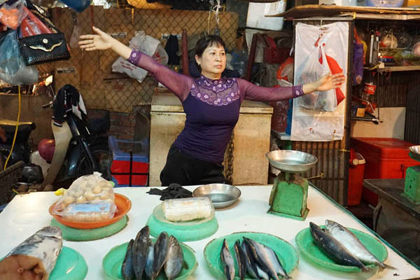 Để việc bán hàng không bị ảnh hưởng, các chị chỉ tập trong giờ vắng khách. Khi có người mua hàng, họ lại tạm dừng để bán như bình thường. Trong ảnh là chị Kiều Hạnh, 50 tuổi, chuyên bán cá đông lạnh, đang luyện Aerobic. Chị chia sẻ, cũng có thể đến lớp học Aerobic được nhưng thấy rất mất thời gian và ảnh hưởng đến buôn bán nên tranh thủ tập ngay tại sạp bán hàng. Tiện đủ đường!