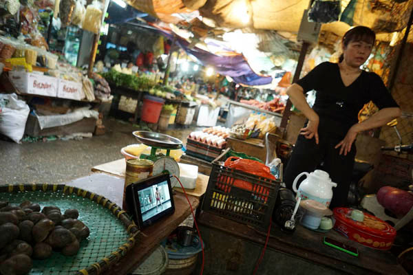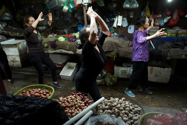 Mọi việc buôn bán tại chợ vẫn diễn ra bình thường, người mua cứ mua, người bán vẫn bán trong lúc tập luyện Aerobic.