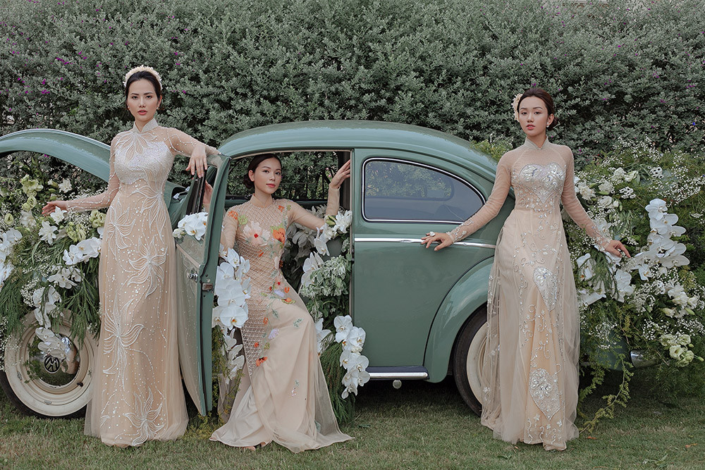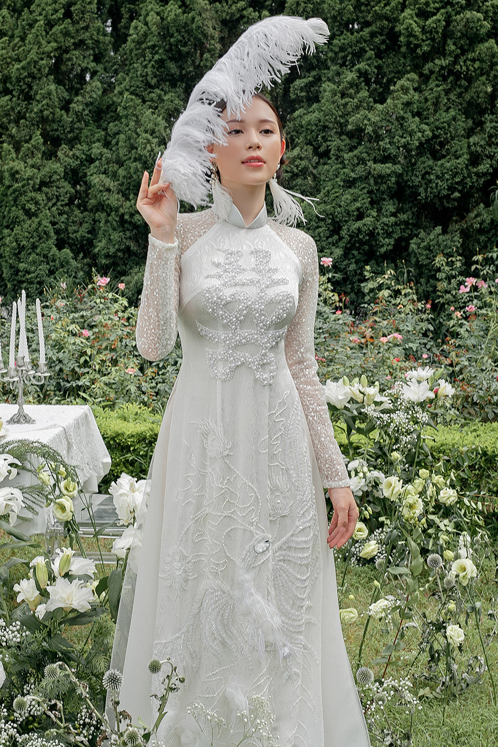 Những mẫu áo dài chất liệu voan xuyên thấu, đính lông vũ cầu kỳ mang lại vẻ kiêu sa khó rời mắt.