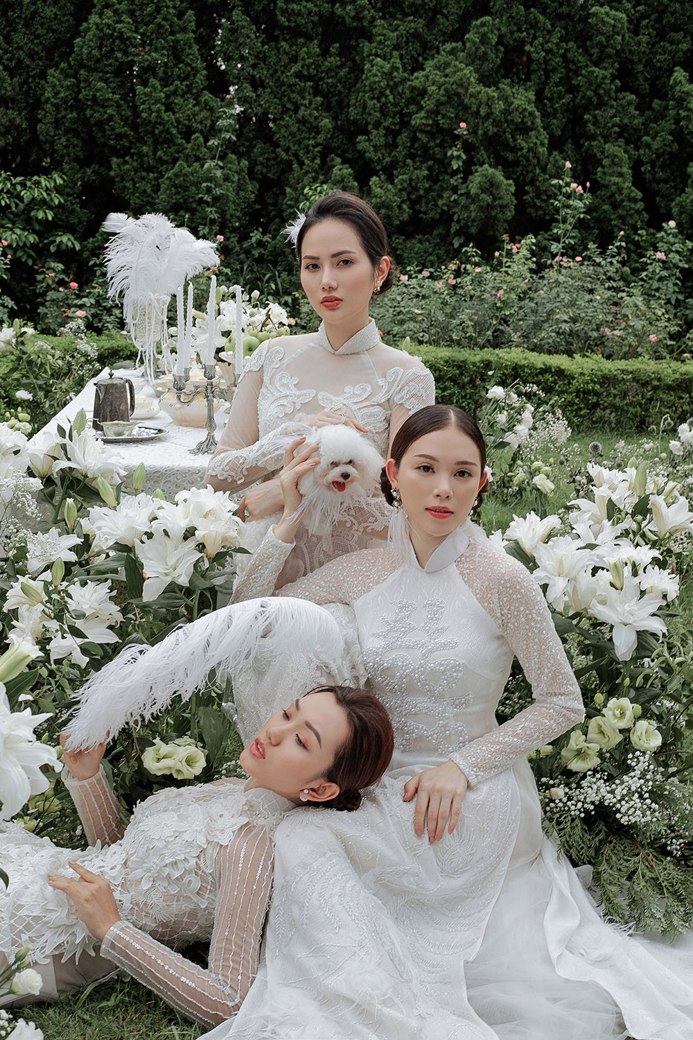 Linh Rin và Diệu Hân hoá cô dâu yêu kiều, xinh đẹp trong khung cảnh lãng mạn đầy hoa.