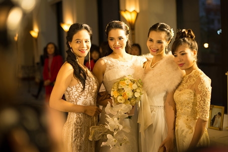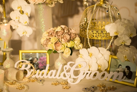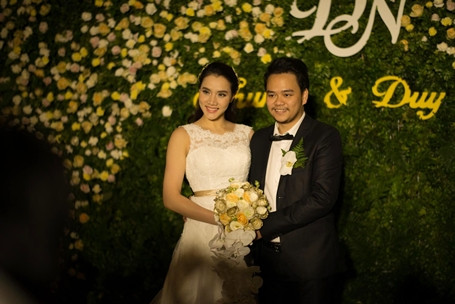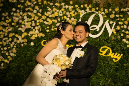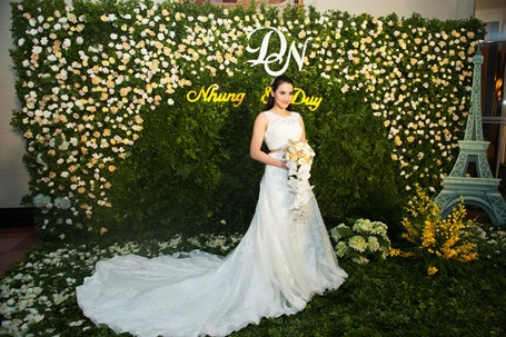 Mặc dù đã tổ chức đãi tiệc ở TP HCM nhưng tại Hà Nội, cặp đôi vẫn đầu tư trang hoàng tiệc cưới tỉ mỉ tới từng chi tiết. Hồng và lan là 2 loại hoa chính được dùng để trang trí trong tiệc cưới của họ. Cô dâu xuất hiện rạng rỡ trong chiếc váy đuôi xòe dài.