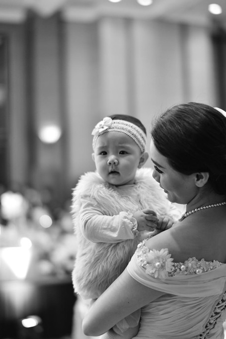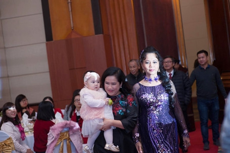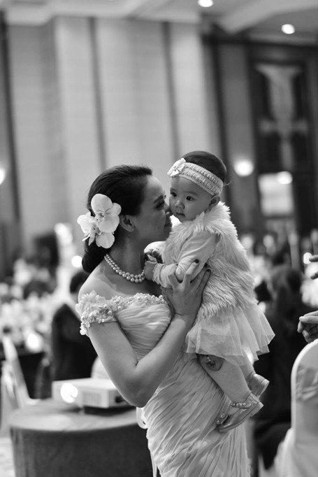 Khác với đám cưới của ba mẹ tại TP HCM, cô bé đã dạn dĩ hơn, không còn khóc nhè khi thấy đông người. Trong ảnh bé được mẹ Trang Nhung cưng nựng.