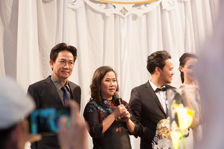 Mẹ chồng Trang Nhung phát biểu cảm ơn bạn bè trong giới văn nghệ sỹ và quan khách, báo chí đã không quản thời tiết Hà Nội một ngày vô cùng lạnh giá để đến chung vui cùng hai con. Người phụ nữ mặc áo dài cách tân độc đáo này vốn được biết đến là nhà văn tài sắc vẹn toàn của nền văn học Việt Nam đương đại. Mối quan hệ của Trang Nhung và mẹ chồng rất tốt.