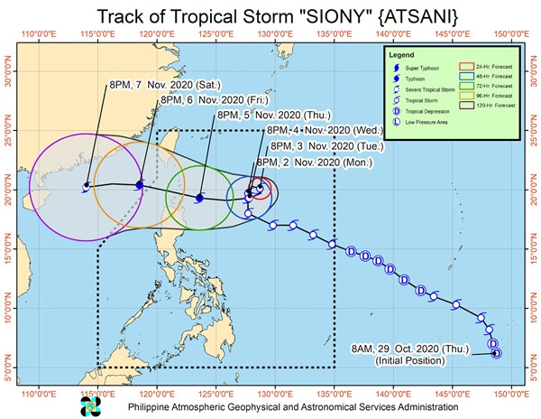 Bão Siony (tên quốc tế là Atsani) đã đến gần Philippines hơn một chút, sau khi bão Rolly (Goni) rời khỏi nước này.