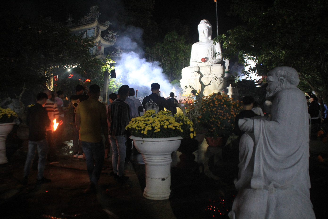 Các bạn trẻ thắp hương tại các bức tượng La Hán trong khuôn viên nhà chùa.Thời điểm hơn 1 giờ sáng ngày mùng 1 Tết Canh Tý có khá nhiều bạn trẻ tìm đến cửa Phật thắp hương