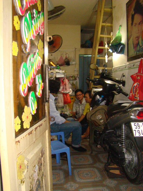 Nhìn quanh không có bất cứ đồ đạc nào giá trị: chiếc mũ bảo hiểm cũ kỹ, những chiếc kéo, vài chiếc cốc nhựa, những bọc ni lông lớn bé để vài thứ đồ và thuốc. Chiếc xe máy (giá trị nhất) là của học trò để đó cho ông muốn đi đâu thì nhờ người chở. Ông mời chúng tôi ngồi vào hai chiếc ghế nhựa, còn mới, khoe: “Chồng của cô ca sĩ Giao Linh tới thăm, thấy không có chỗ để ngồi nên ổng mua tặng tui hai cái ghế và cả tấm nệm để tui nằm cho êm”.
