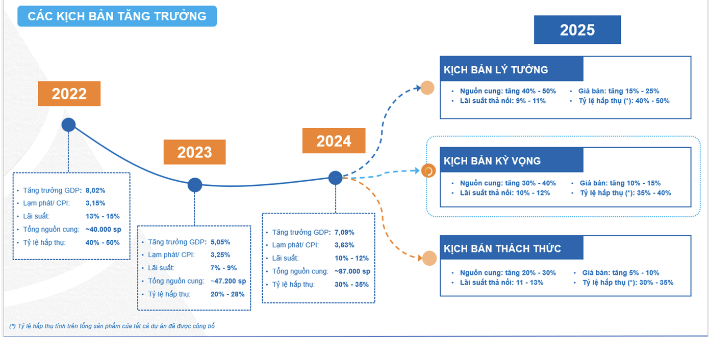 Kịch bản lý tưởng là nguồn cung mới tăng mạnh từ 40 - 50%, lãi suất thả nổi ở mức 9 - 11%, giá bán tăng 15 - 20% và tỷ lệ hấp thụ đạt từ 40 - 45%. Đây là kịch bản lạc quan nhất, kỳ vọng vào sự phục hồi sớm của thị trường.
