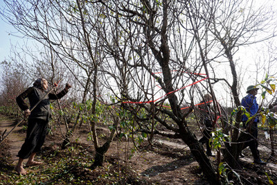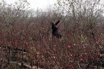 Các chủ vườn đào Nhật Tân đang cưa những gốc đào rừng chuẩn bị ghép mắt đào bích cho năm sau, khi nhiệt độ Hà Nội xuống thấp kèm mưa