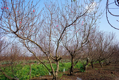 Nắng lên, vườn đào khoe những nụ hoa sớm đầu tiên trên cánh đồng đào Nhật Tân.