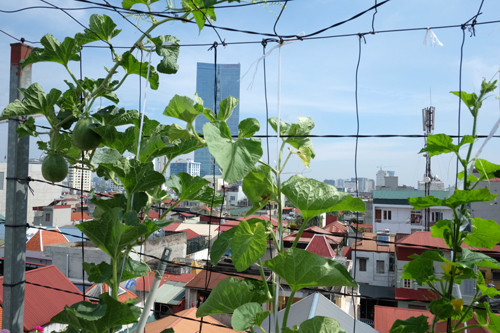 Nhà tầng 6 nhưng vẫn có nhiều ong bướm giúp hoa thụ phấn. Khi cây trổ quả, chị Thu cắt bớt ngọn để cây tập trung nuôi trái.