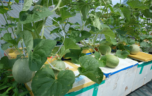Gia đình làm cột, đan lưới để các loại dưa mọc bám theo.
