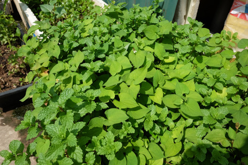 Các loại cây gia vị như húng, diếp cá mọc xen lẫn um tùm mà không cần nhiều đất.