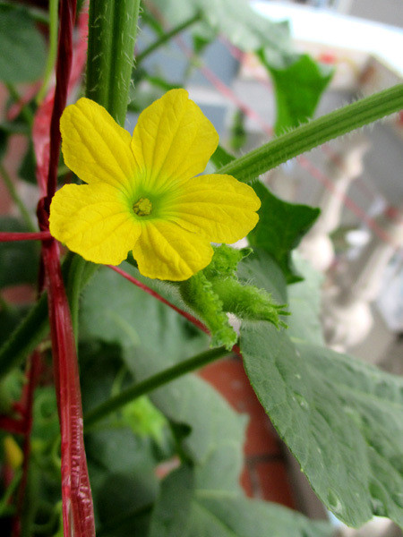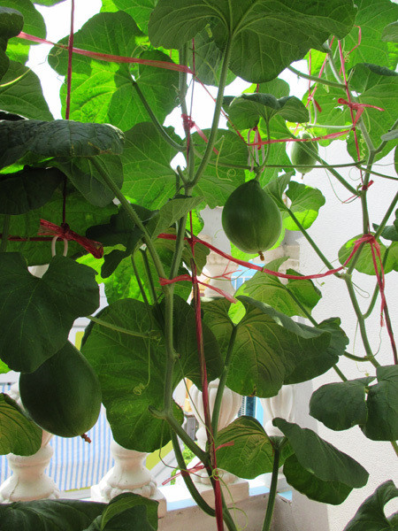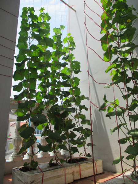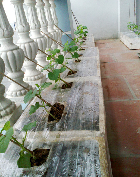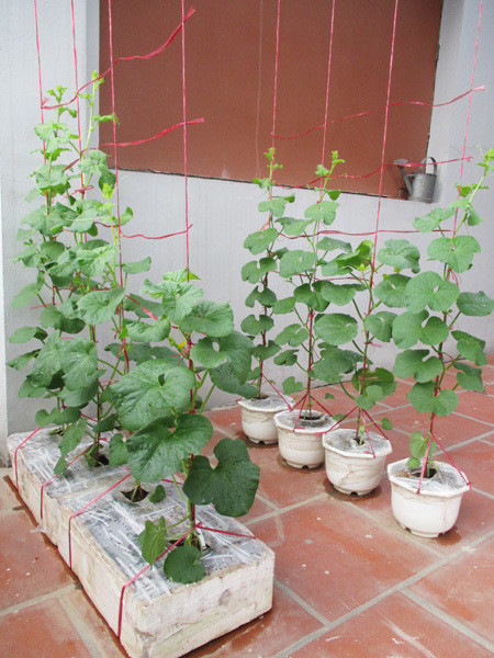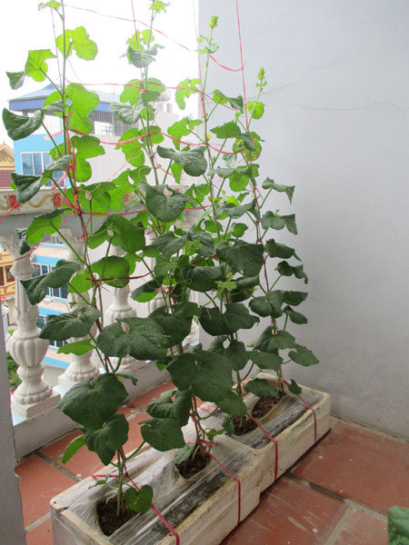 Trồng các loại cây có chiều cao như dưa trên tầng 5 gặp nhiều khó khăn bởi gió to ảnh hưởng đến sự phát triển của cây. Vì vậy, chủ vườn đã cố định thật kỹ giống cây có thân leo mềm.