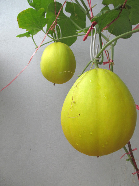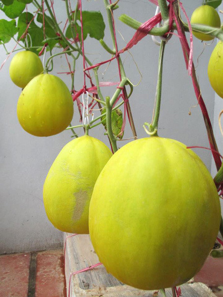 Thành phẩm là những quả dưa trĩu nặng phải buộc lên để không làm gẫy cành