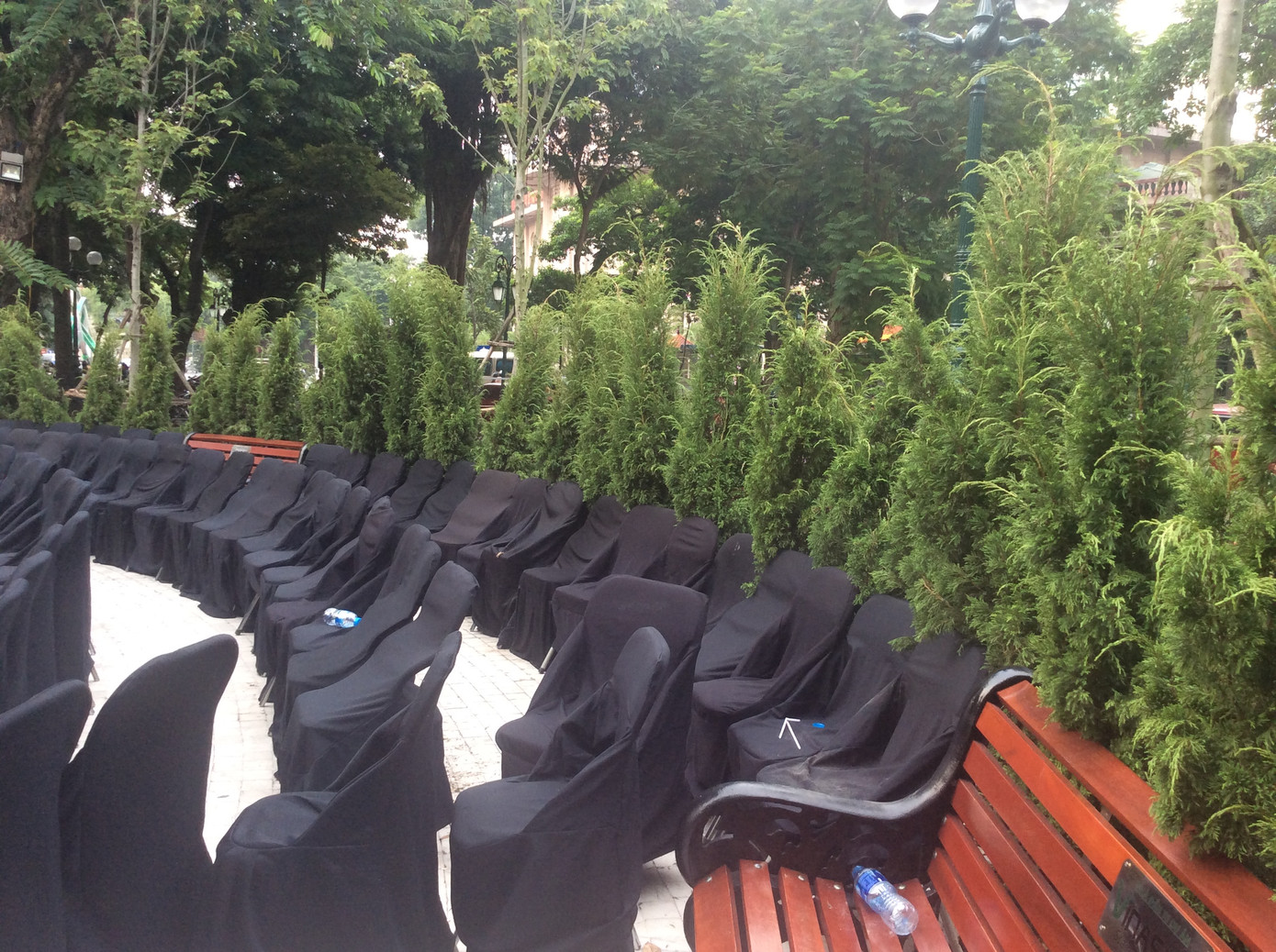 Theo Minh Hạnh, Vườn hoa Con Cóc tức Vườn hoa Diên Hồng hiện được thành phố cải tạo khá đẹp nhưng để làm không gian biểu diễn thì chưa đủ, vẫn chỉ là một vườn hoa. Vì vậy, trong đêm 12/9, có 300 cây tùng đã được điều từ Thái Bình về để trang trí vòng quanh khu vực sân khấu, coi như hàng rào ngăn cách sân khấu với không gian náo nhiệt bên ngoài.